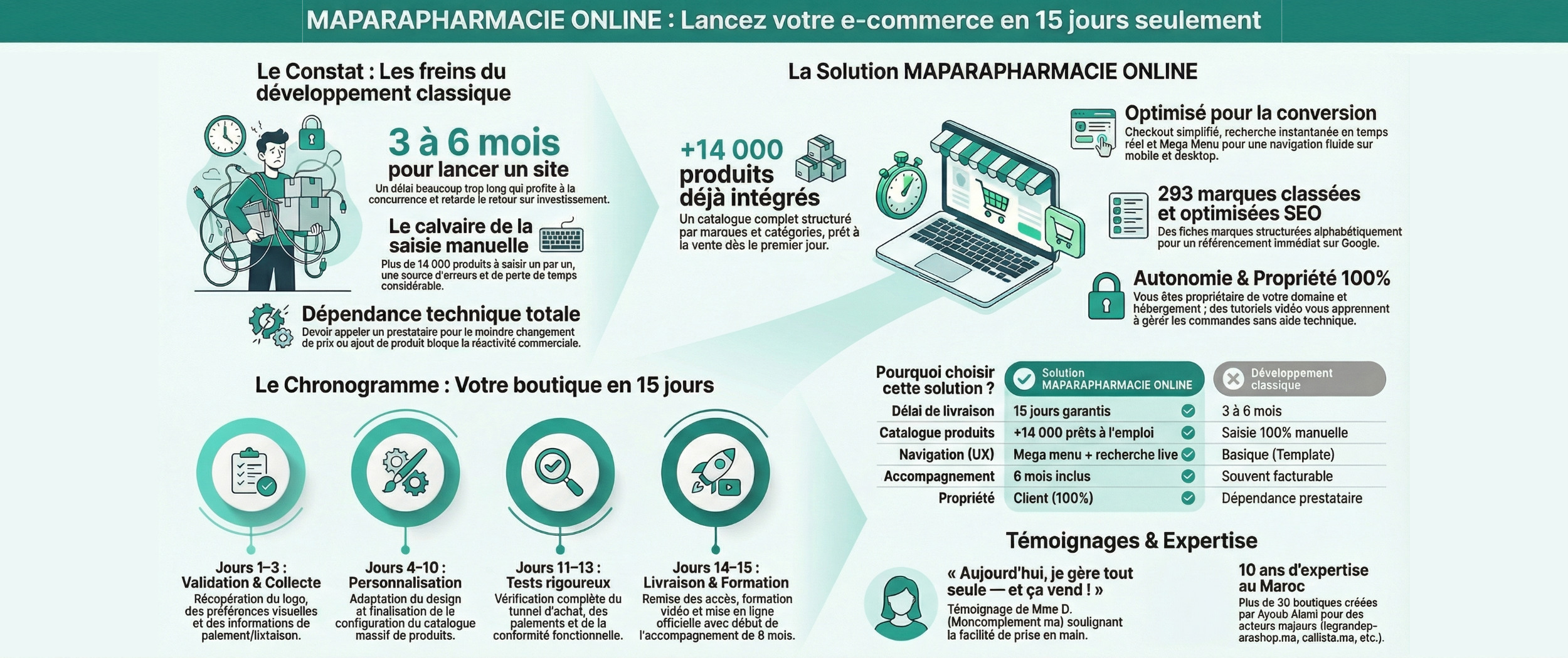 | Critères | Solution MAPARAPHARMACIE ONLINE | Développement classique |